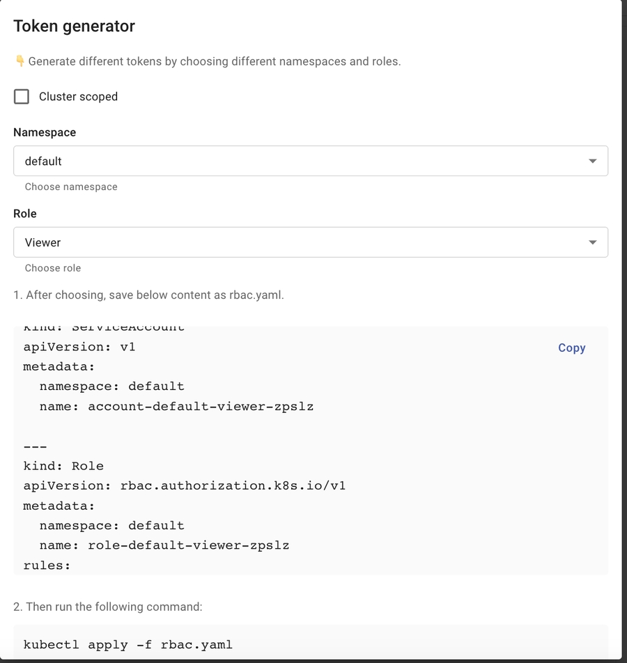 根據所需權限,選擇namespace或是整個 Cluster,並按照步驟建立rbac 和 token