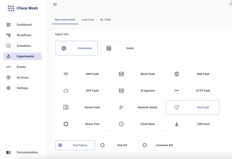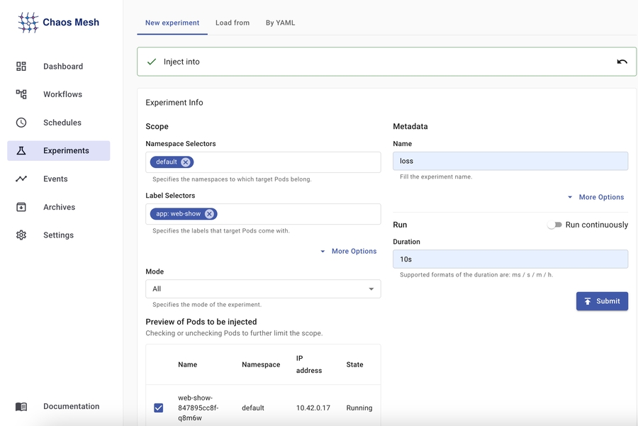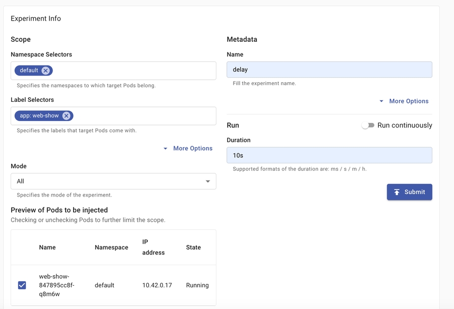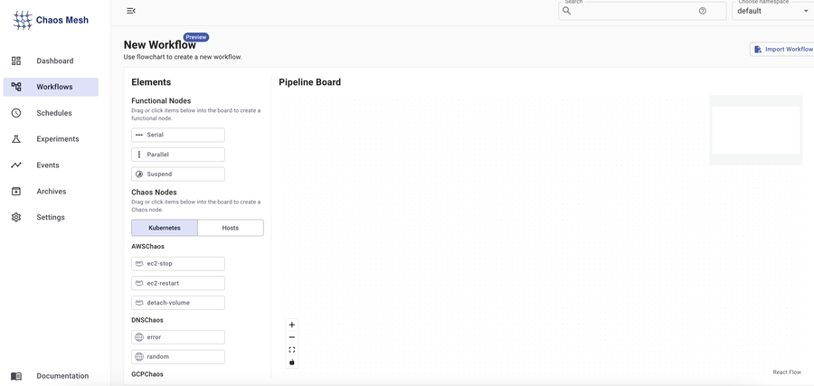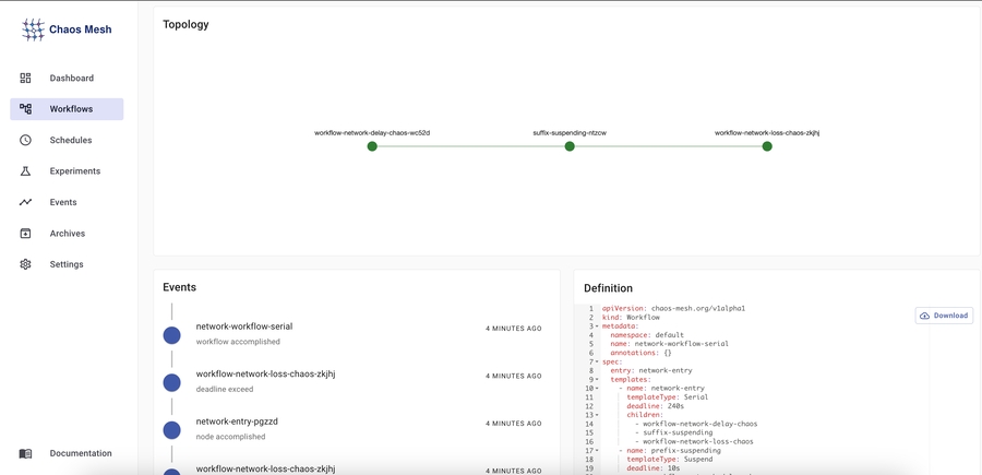 network delay 10ms 持續20s -> 暫停 5s -> network loss 100% 持續20s可以透過 UI 來制定 workflow