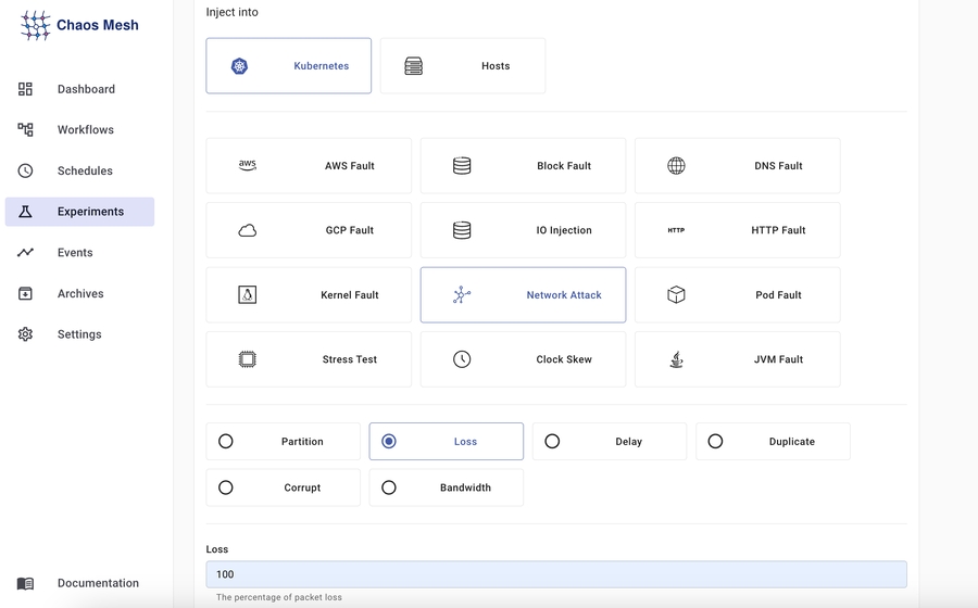 建立一個實驗,類型為網路封包遺失,遺失率為 100%