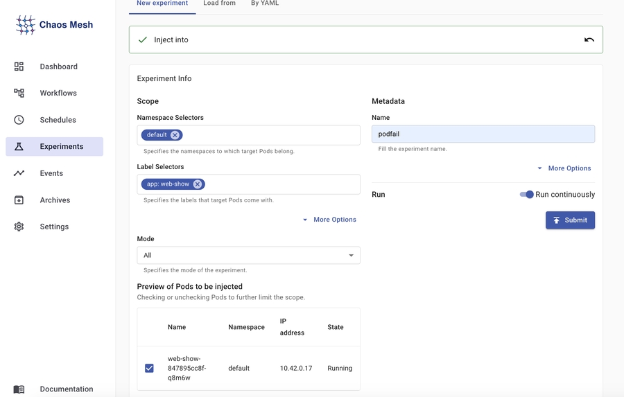 helm install chaos-mesh chaos-mesh/chaos-mesh -n=chaos-mesh -f values.yaml透過 NodePort 進入 dashboard