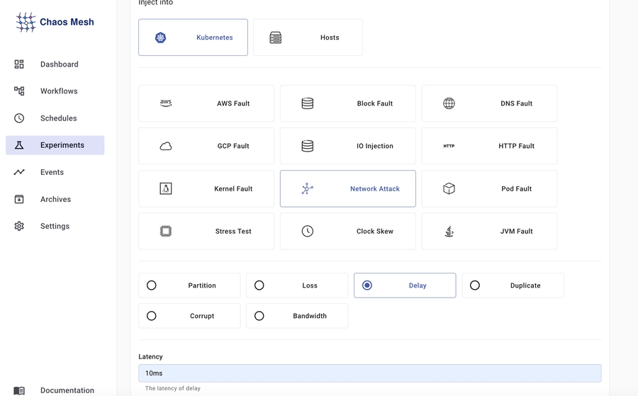 建立一個實驗,類型為網路攻擊的延遲,設為 10ms